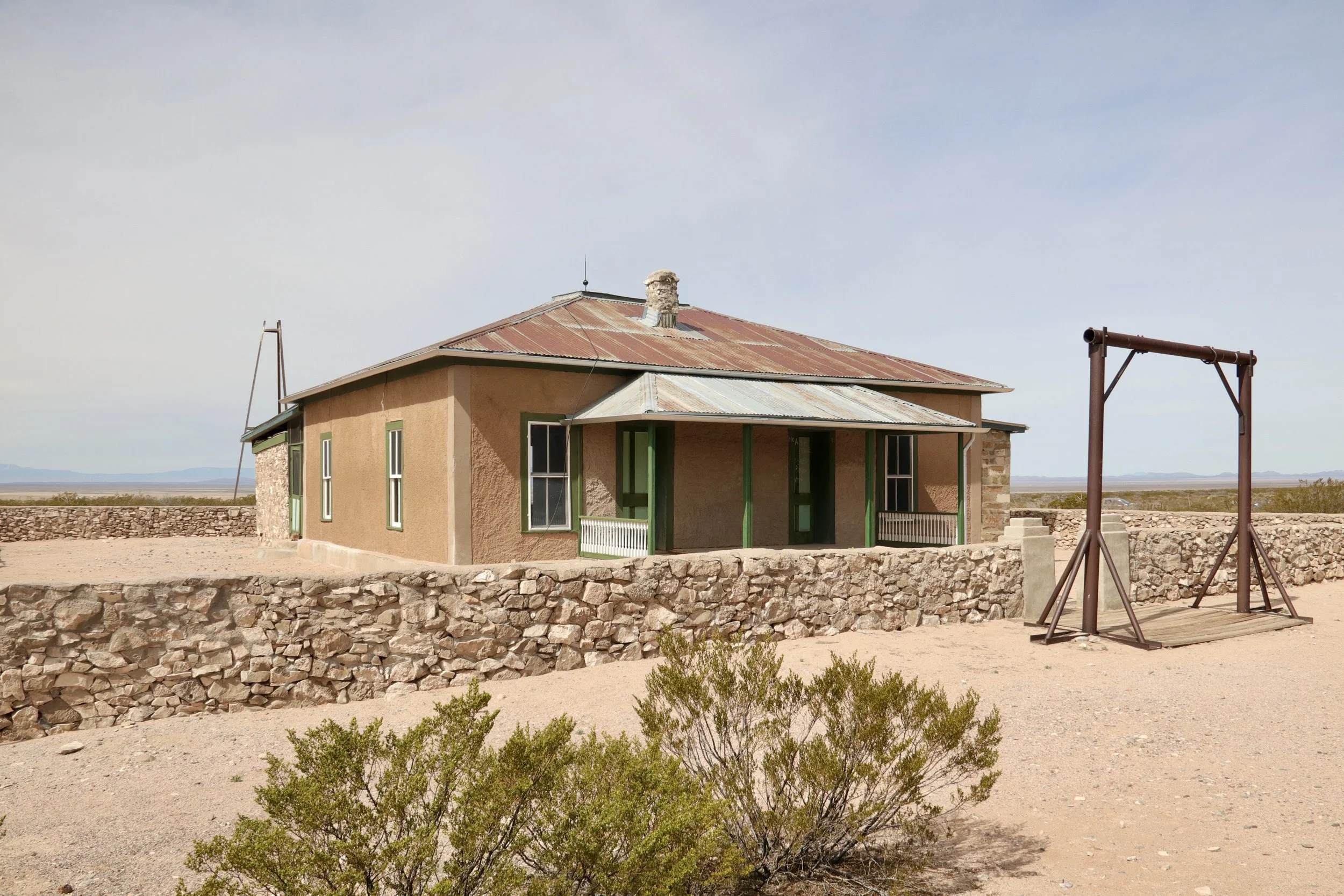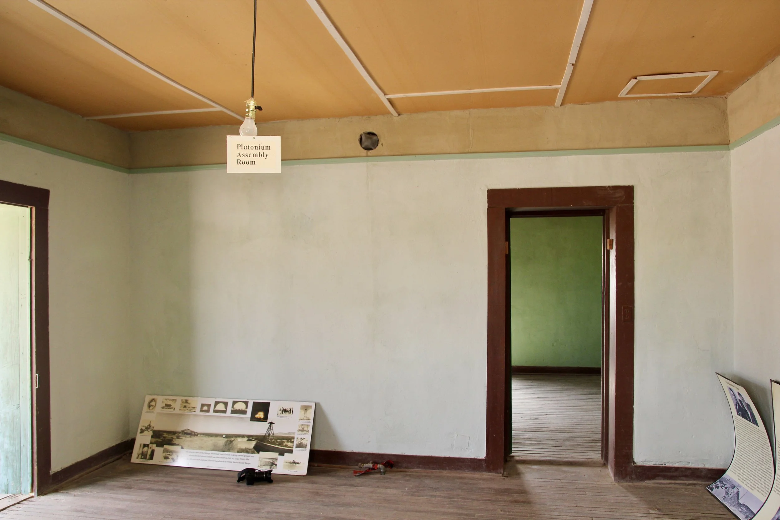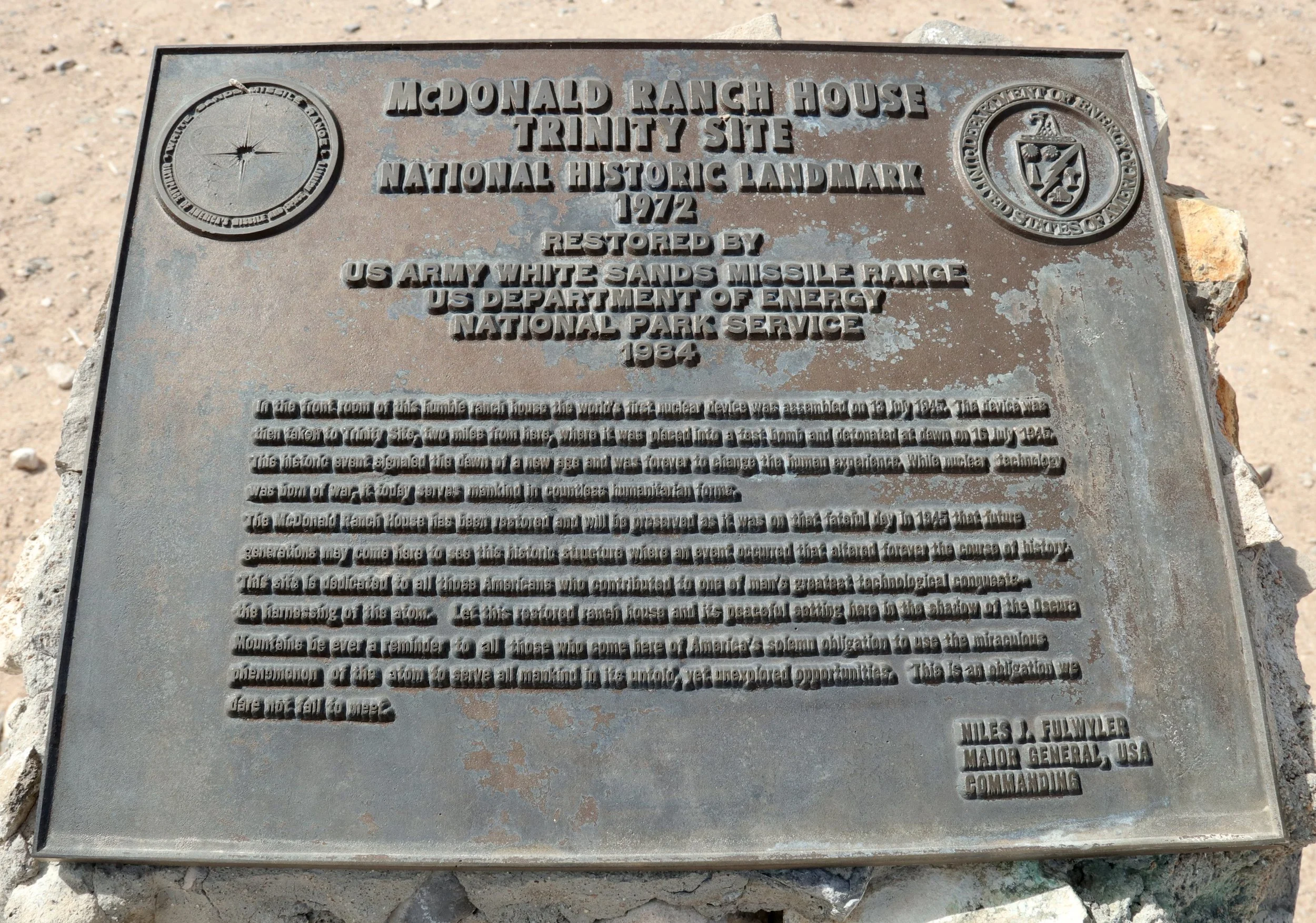 A modest adobe ranch house sits two miles southeast of Ground Zero. It was here, at the Schmidt/McDonald house, that the plutonium core of the bomb was assembled in a “clean room” before insertion into the bomb apparatus. The house was built in 1913 by a German immigrant, Franz Schmidt, and later acquired by another rancher, George McDonald. After World War II began, the government took control of the property as it established the surrounding area as a training range. After the Trinity test, the house was abandoned and remained abandoned until the 1980s when the National Park Service restored it to its 1945 appearance.