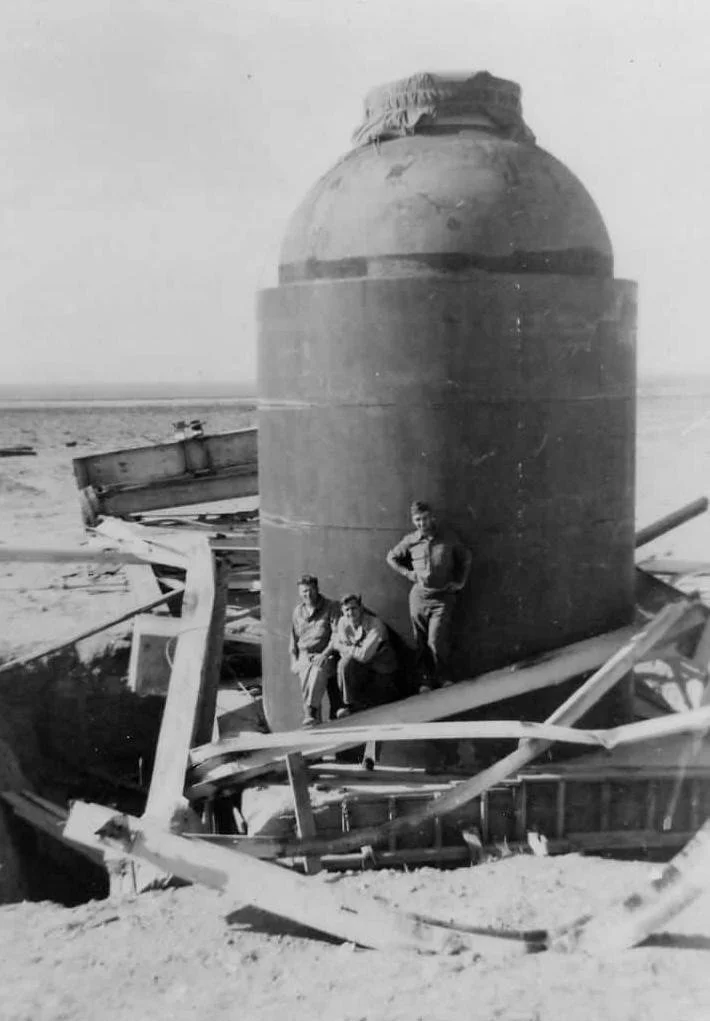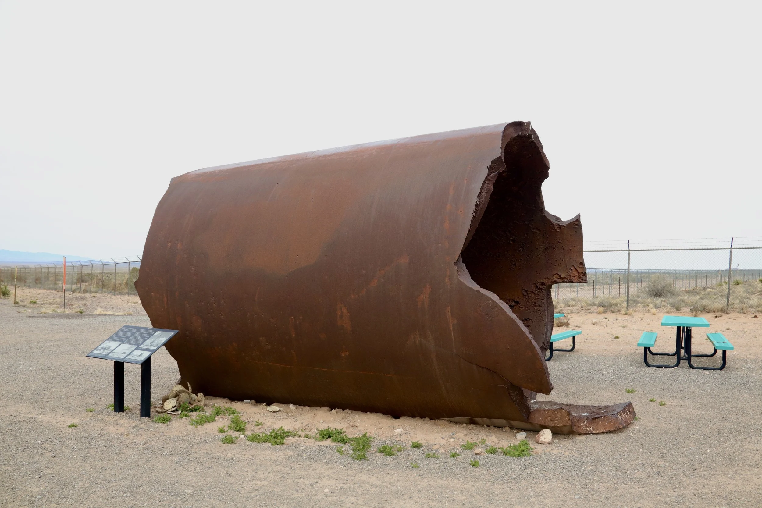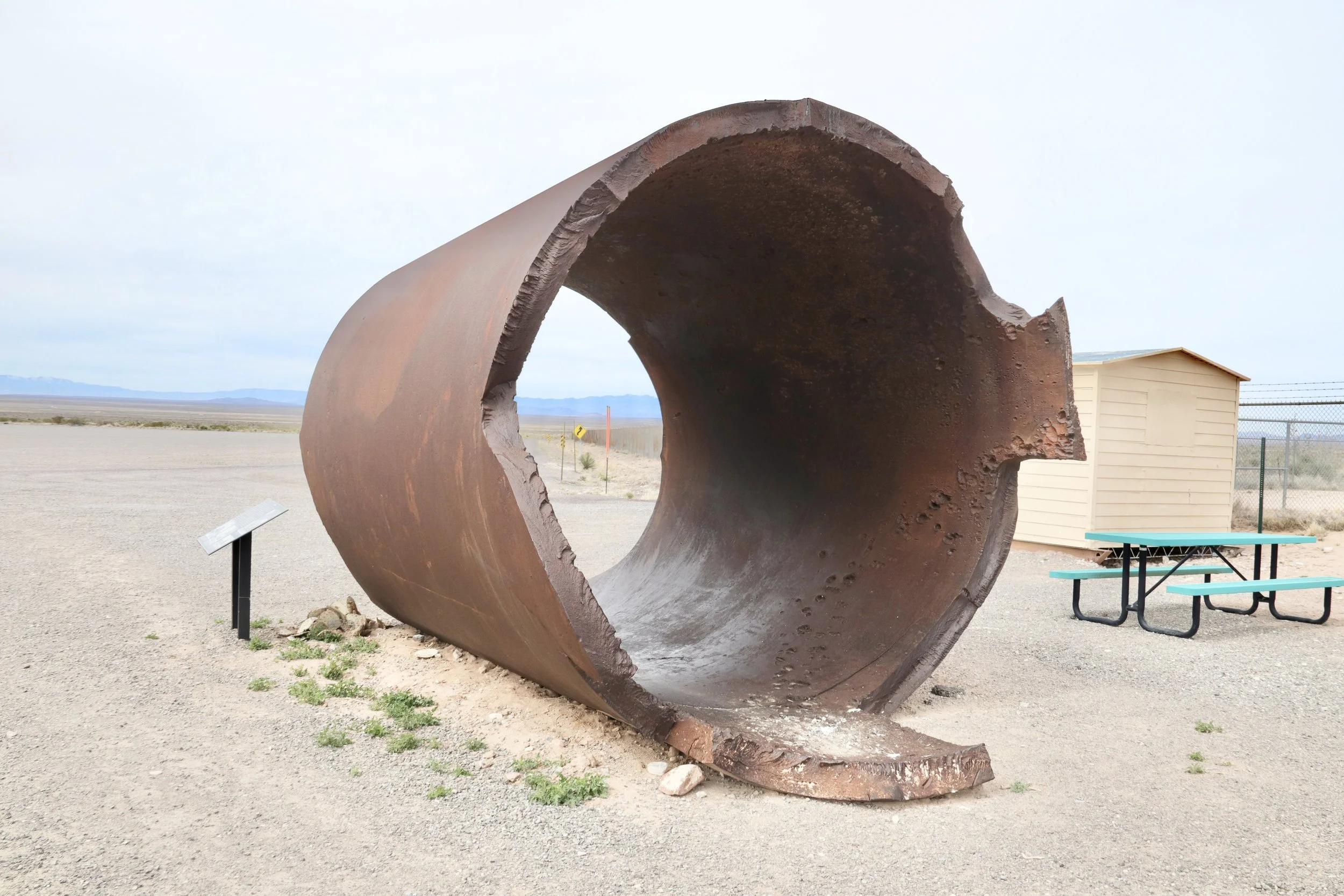 Jumbo survived the test although the steel tower did not. The US Army later decided to destroy Jumbo, and in 1946 detonated eight 500-pound bombs inside of the vessel. Those bombs blew off both ends, but Jumbo’s body remained relatively intact, due to its 14-inch-thick steel walls. Today, Jumbo is on display at the edge of the Trinity Site parking lot.