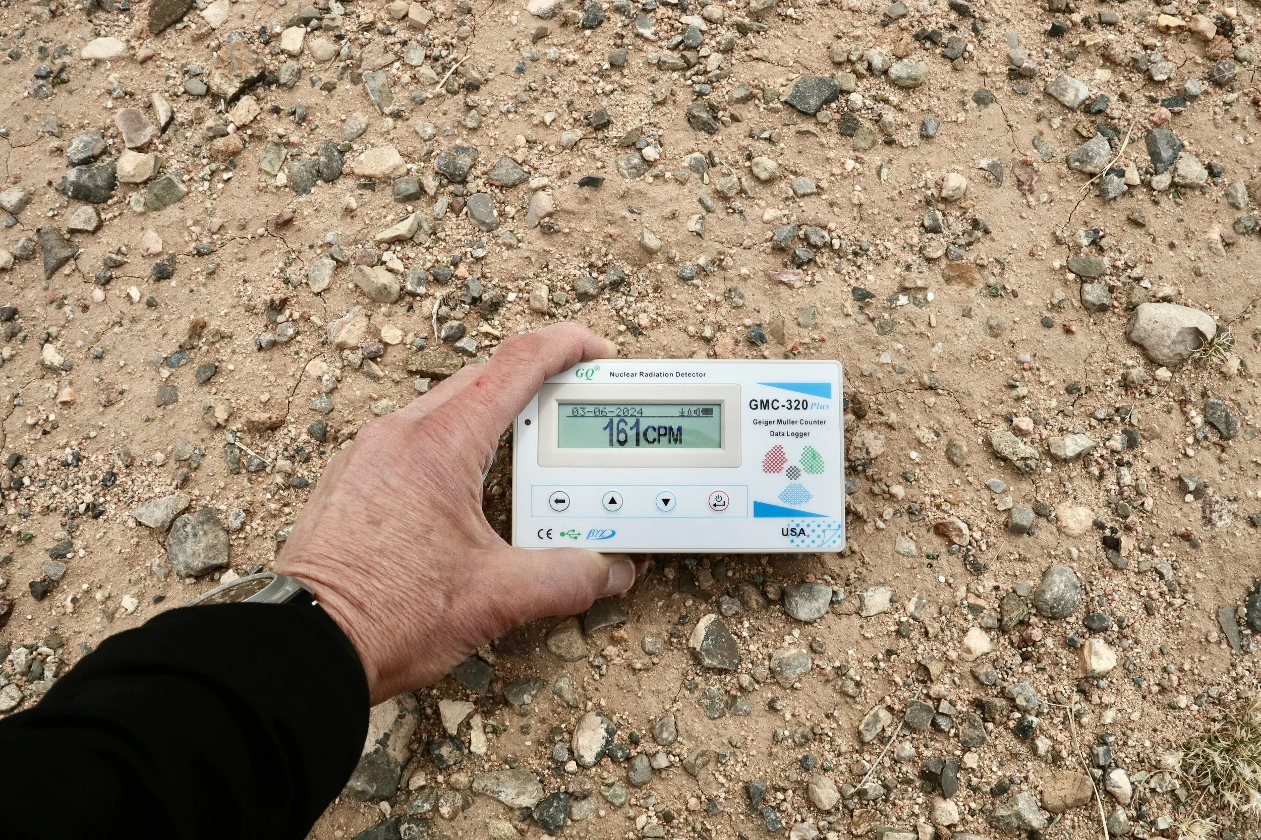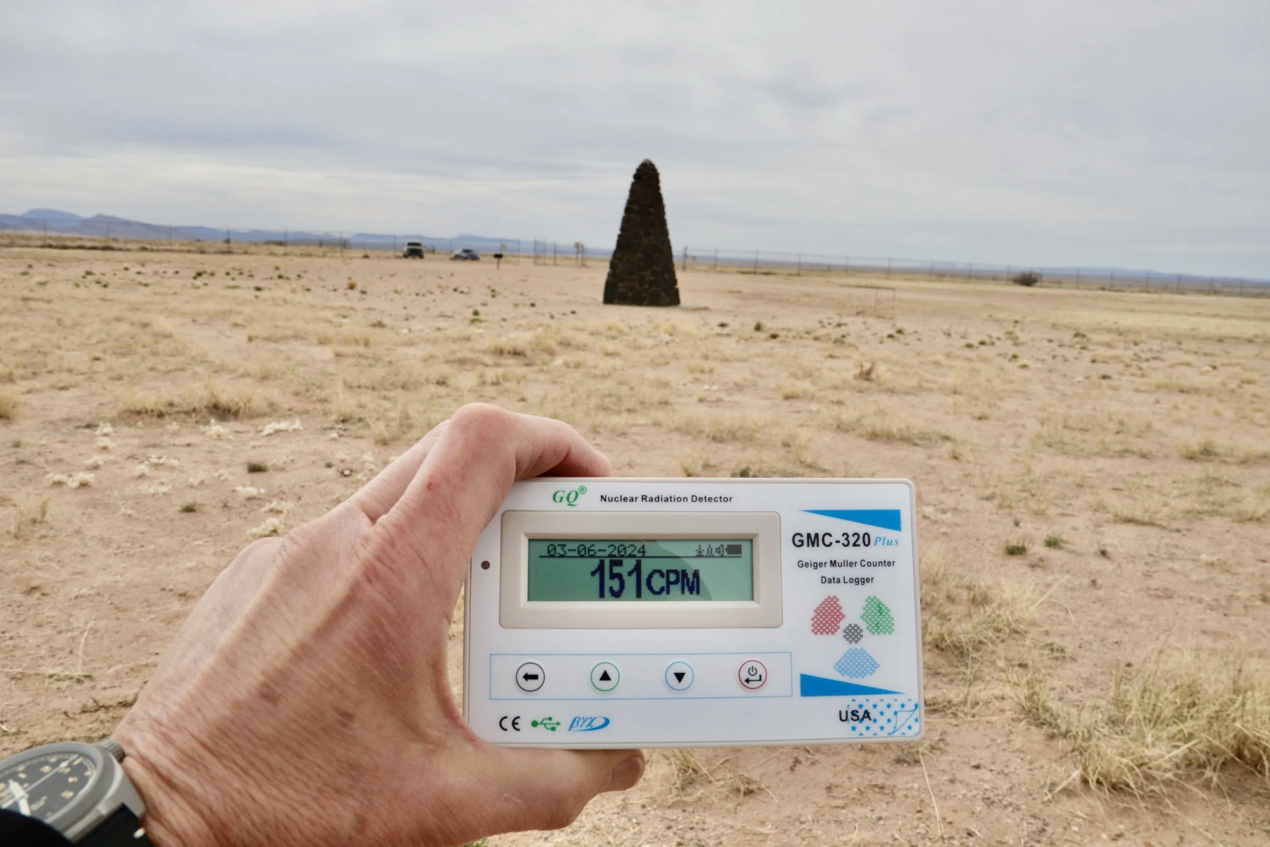 Out of curiosity, I brought along a radiation detector, often known as a Geiger Counter. The device measures Counts Per Minute or CPM. The readings generated at Trinity Site were reasonably low and seemed in line with normal background radiation levels (which are typically between 10-60 CPM). Some higher levels were generated by moving the detector to different spots along or above the ground.